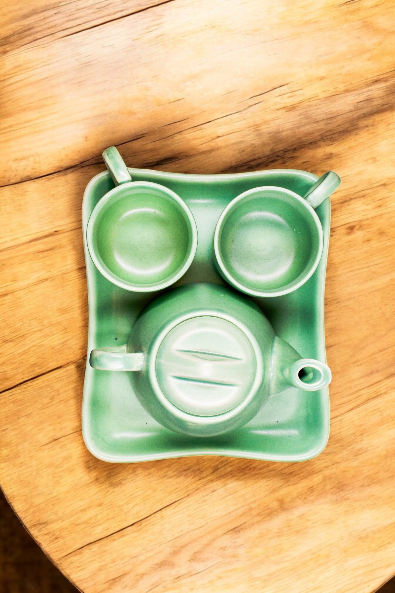 This adorable cutting chai tea set includes two little cups and a kettle, perfect for a quick and cozy tea party. The matte finish and cute green color add a touch of whimsy to your tea time. A must-have for all tean lovers!