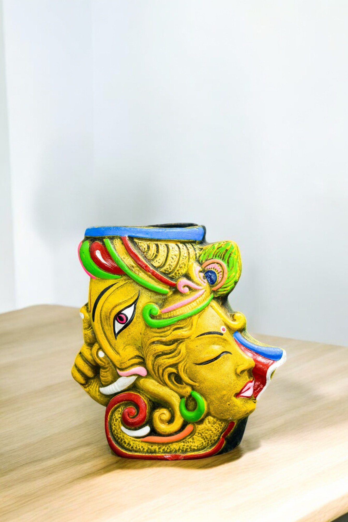 This is exclusive designed handmade Ganesha and Krishna idol multipurpose decorative pen stand you can use it as flower pot, pen stand or can gift it to ypor loved ones. This can be used as table centre piece , décor item for home and office